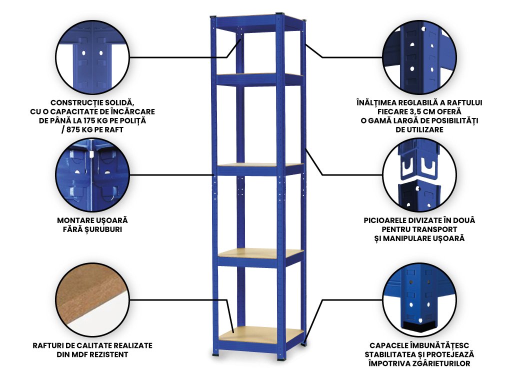 O proprietate excelentă a rafturilor este instalarea fără șuruburi (modul de instalare este mai jos) și stabilitatea înaltă a acestora. Acest raft, omul și-l poate înălța singur. Este adecvat a se amplasa la zid și a se ancora, eventual îl puteți amplasa în spațiu. Și la acest raft acordăm clienților noștri o garanție prelungită de 7 ani.