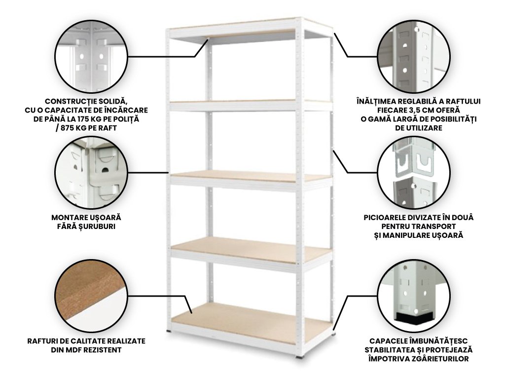 O proprietate excelentă a rafturilor este instalarea fără șuruburi (modul de instalare este mai jos) și stabilitatea înaltă a acestora. Acest raft, omul și-l poate înălța singur. Este adecvat a se amplasa la zid și a se ancora, eventual îl puteți amplasa în spațiu. Și la acest raft acordăm clienților noștri o garanție prelungită de 7 ani.