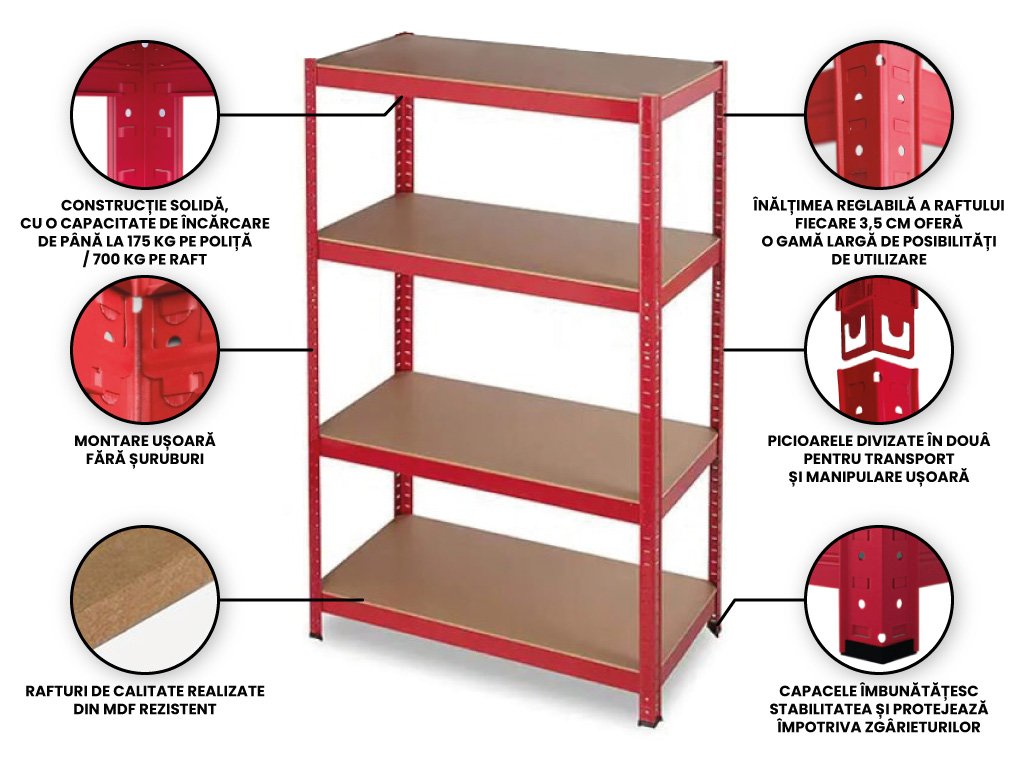 MEGA HIT: Raft lăcuit cu 4 polite, 150x70x30 cm, portanta 700 kg - ROSU