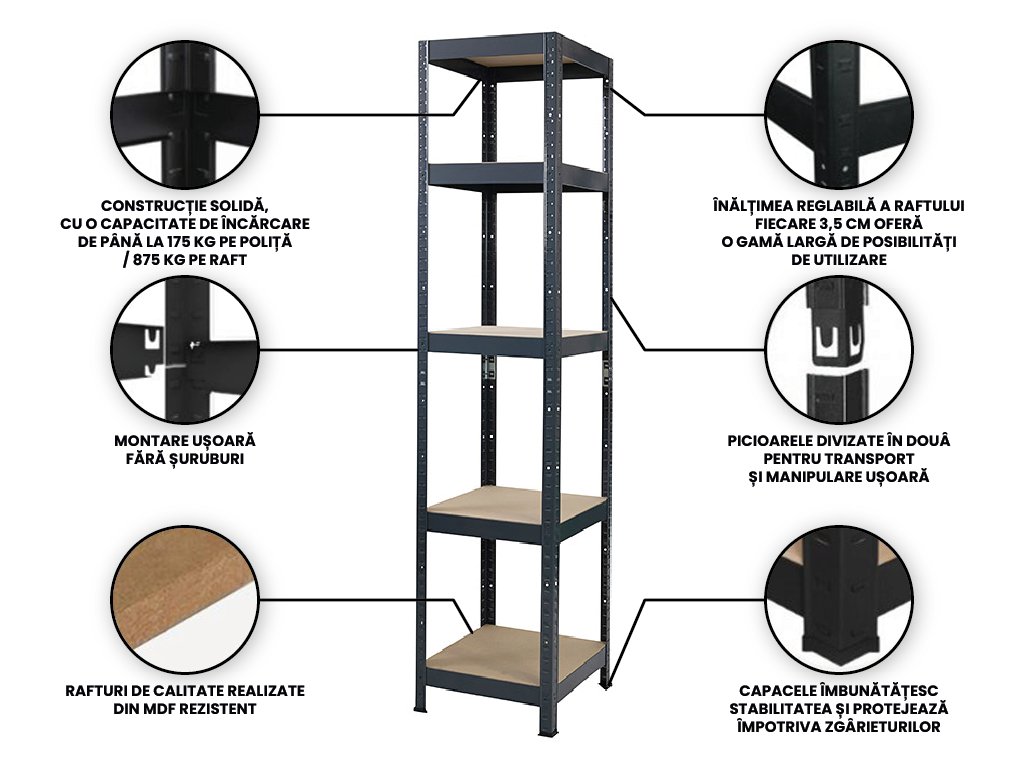 O proprietate excelentă a rafturilor este instalarea fără șuruburi (modul de instalare este mai jos) și stabilitatea înaltă a acestora. Acest raft, omul și-l poate înălța singur. Este adecvat a se amplasa la zid și a se ancora, eventual îl puteți amplasa în spațiu. Și la acest raft acordăm clienților noștri o garanție prelungită de 7 ani.