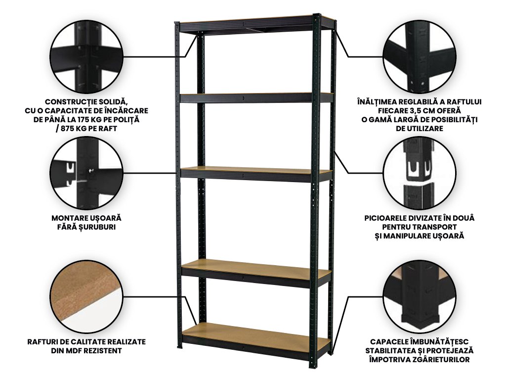 Un suport de tip standard cu o capacitate de încărcare de până la 175 kg pe raft poate fi folosit atât în casă, cât și la birou sau într-un depozit mai mic. Asigură depozitarea clară a mărfurilor, documentelor sau uneltelor și economisește spațiu. Materialul de înaltă calitate și construcția durabilă asigură o durată lungă de viață și rezistență la deteriorare. În același timp, asamblarea acestuia este foarte ușoară, iar asamblarea raftului nu durează toată după-amiaza.